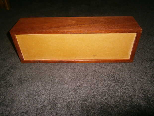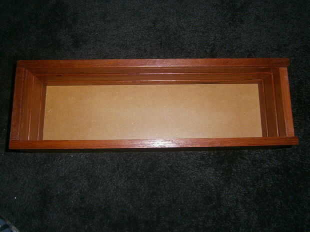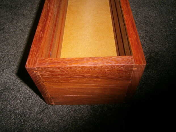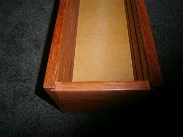 Después de lijar las piezas, pegar juntos. Coloque una pequeña cantidad de pegamento dentro de las ranuras de la Jarrah, luego ajuste la pieza de 380mmx110mm de MDF dentro de las ranuras. Apriete ajustado, asegúrese de que todos los bordes queden al ras, y los extremos de la abrazadera. Las dos piezas cortas de Jarrah deben caber dentro de los dos más grandes. Limpie cualquier exceso de pegamento mientras está todavía húmedo.