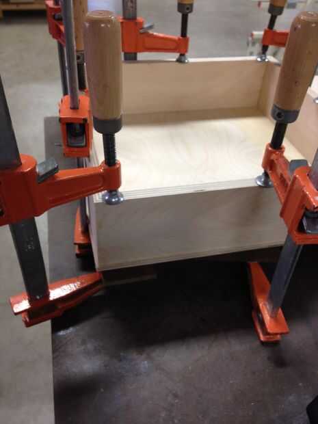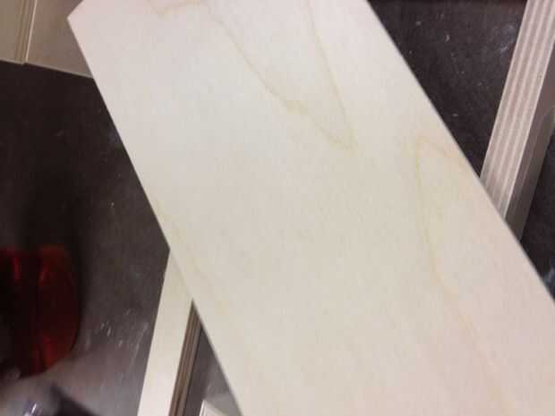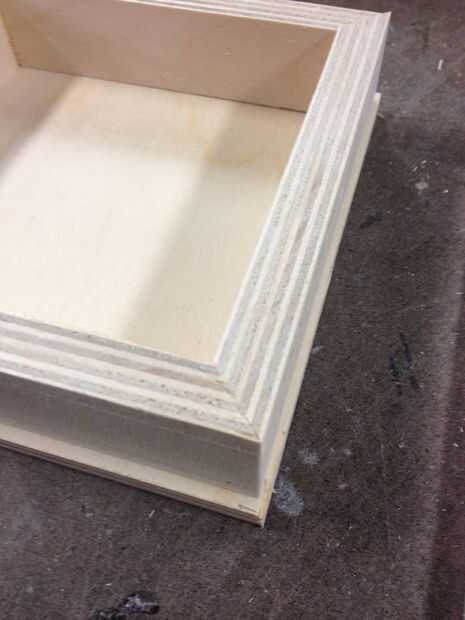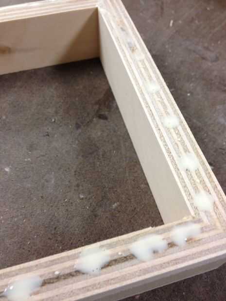 Agregar una madera pegamento a la tapa de la caja Asegúrese de que el pegamento e incluso sobre la superficie. Coloque la madera contrachapada de 1/8 en y línea de la madera para que tenga un poco más de caída.