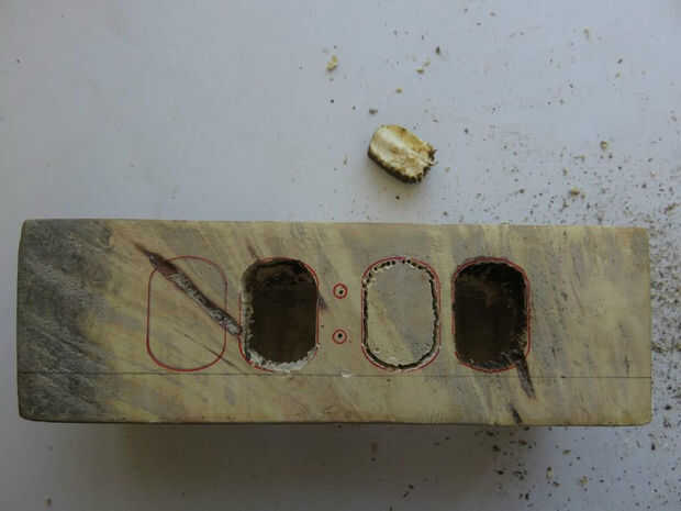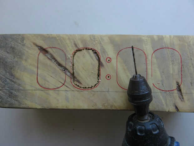 Siguiente paso es abrir los orificios del tubo. Con mi dremel con broca para madera (1mm) abrí 4 agujeros para los tubos (nixie en 12) y 2 agujeros redondos para los puntos.