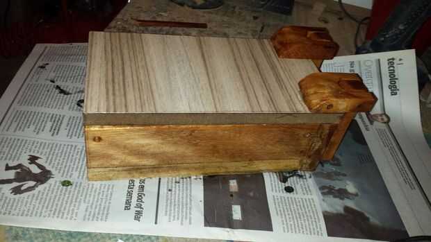 Después un embrague das dobradiças, toda caixa foi lixada e pintada com verniz.
