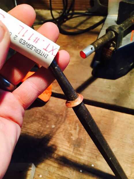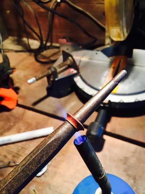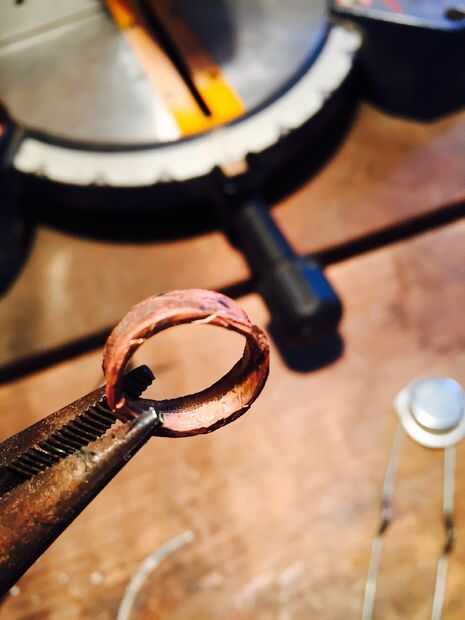 Cuando la perra está curvada sobre a medio camino, cuidadosamente Quite desde el golpe y poner en sentido contrario. Calor otra vez y golpeó con el pvc. Cuando el anillo es plano, quitar del golpe y empezar a forma.