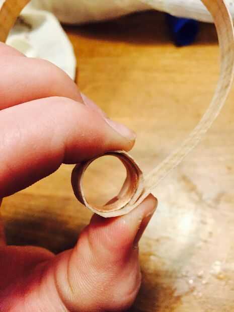 Para este anillo que quería la banda para estar un poco más gruesa envuelve la chapa alrededor del ring 3 veces. Cuando se tiene toda la madera en el anillo, corte el exceso y puede empezar a lijar.