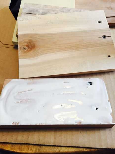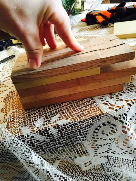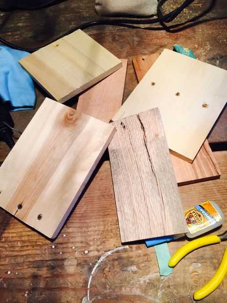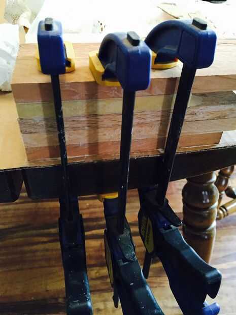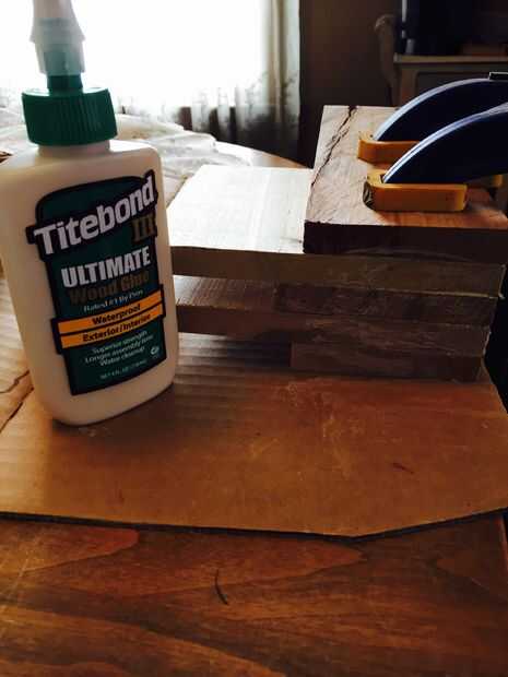 Yo tenía un montón de desechos de la plataforma de algunos de mis otros proyectos. Ya había sido planeados para no tener que ir aunque eso paso. Me pegan 5 piezas de plataforma y dos de los lados alineado. Ponerlos en orden para que los diferentes colores contrastaría con los demás. Después de pegar llevó a la sierra para cortar ingletes.