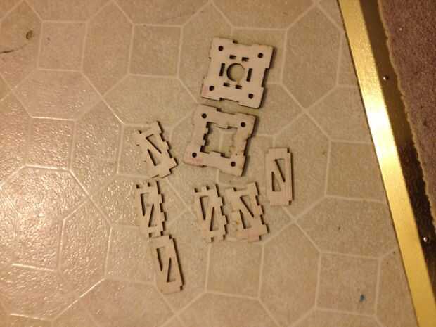 En este punto el CAD ha terminado y me fui a cortar las piezas. Para hacer el corte usé velocidad 60%, 90% de potencia y 500hz en el cortador del laser Epilog 60 vatios. Requiere varias pasadas para cortar a través pero dará buenos bordes cuadrados con charing mínimo.