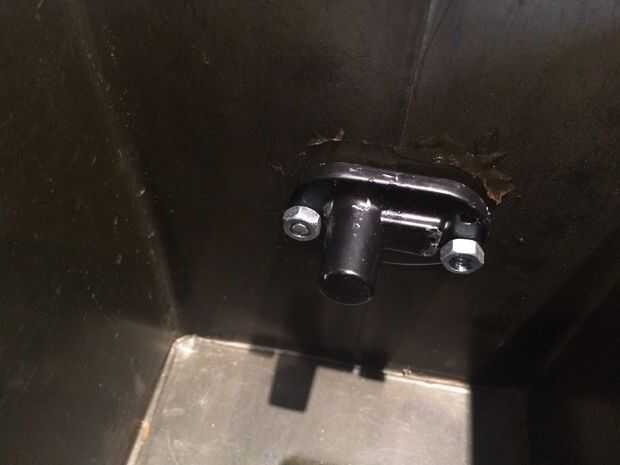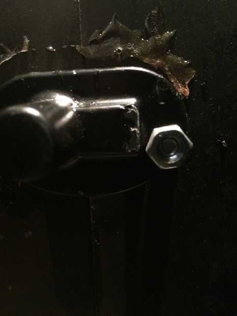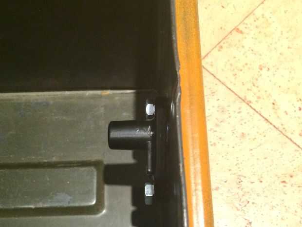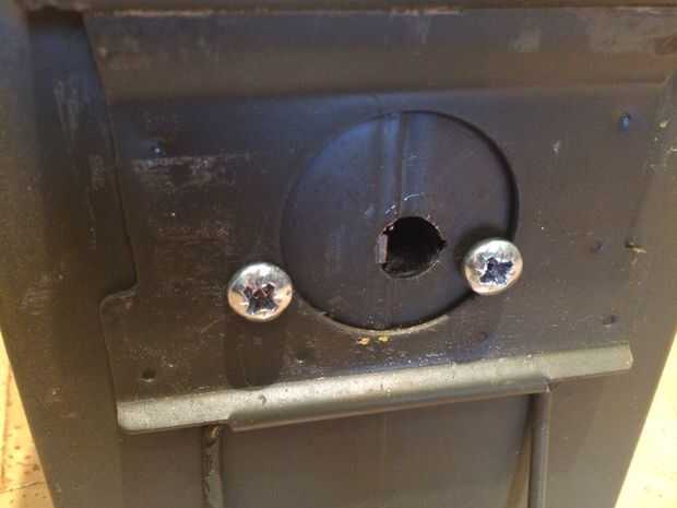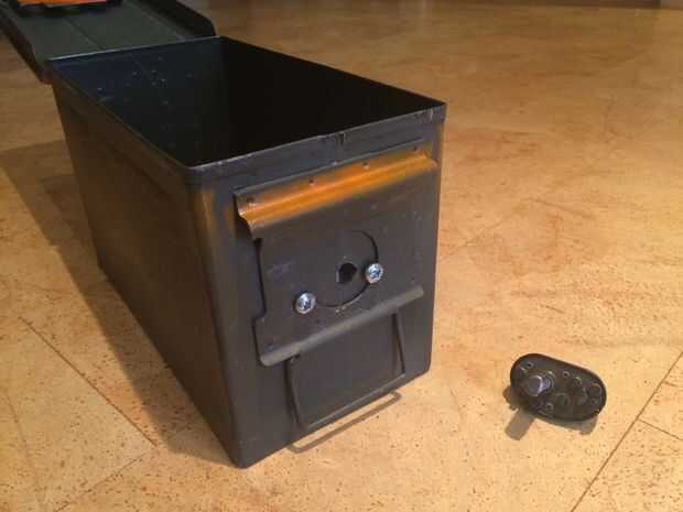 Desafortunadamente no tomo fotos mientras hacen la reparación, pero es bastante simple. Perforé dos agujeros en la lata y dos agujeros en la parte de respaldo de la cerradura, asegurándose de no dañar el mecanismo. Taladré los agujeros que fueron alineados, y luego todo lo que tienes que hacer es usar dos tornillos y tuercas para sujetar la cerradura más permanentemente a la lata. Si usted quería hacer tan seguro como sea posible, puede usar loktite rojo sobre los peldaños o, si se utiliza hardware de acero, podría soldar el frente y atrás el extremo de cada perno para evitar ir a cualquier lado. Personalmente sólo dejé el hardware pelado y hasta ahora no hay más problemas.
