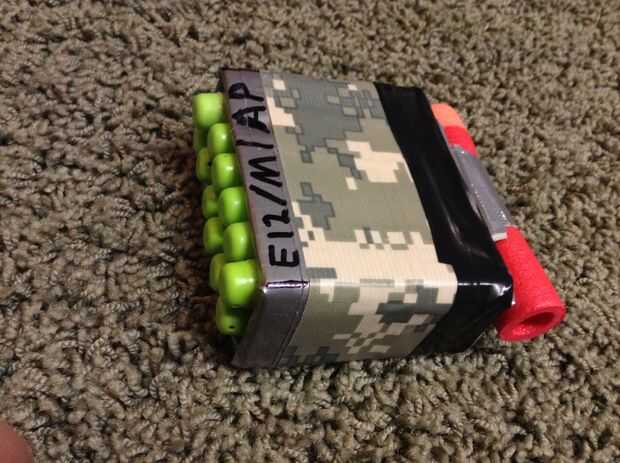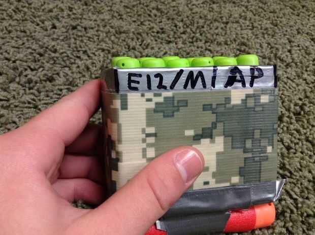 Esto es otra parte opcional. Lo que hice es escribir "AP E12/M1," básicamente lo que significa es un pack de munición con 12 dardos elite y dart un mega. Luego añadí cinta aislante alrededor de la parte inferior sin ninguna razón que no sea el hecho de que parecía fría.