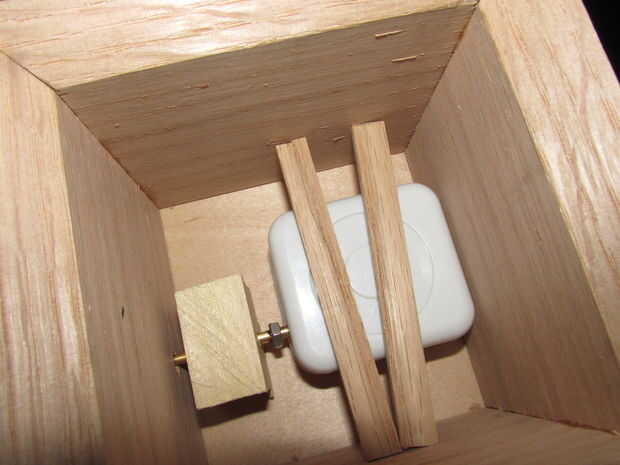 Cortar un trozo de madera bajo que mantenga la clavija constante y super pegado una tuerca en la varilla de latón para evitar la barra caiga fuera de la caja y también dejar el pin de que el momento en el movimiento y me daño el pin delicado que funciona el ventilador.