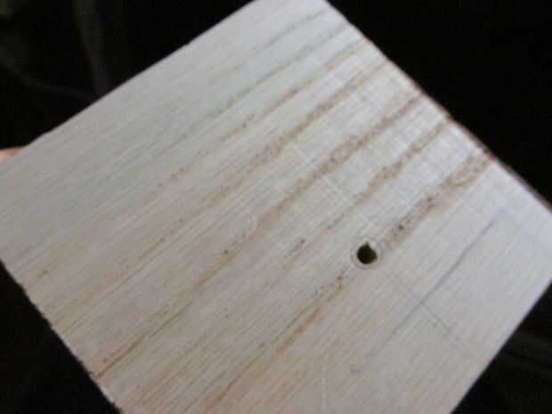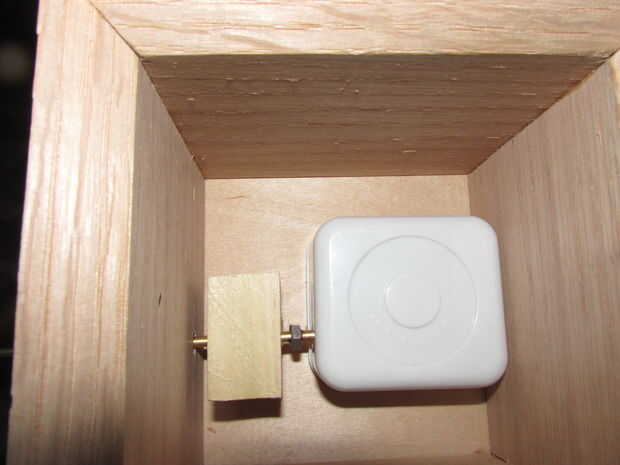 Cuidadosamente midió la posición del agujero en la caja de música y perforó un agujero correspondiente en el cuadro donde puedo insertar un perno de cobre amarillo que se deslizará hacia adelante y hacia atrás para iniciar y detener la música.
