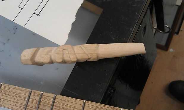 La pieza tallada de isla de Pascua es lo que se utiliza para el traste el instrumento y tradicionalmente la pluma de una pluma de ganso con todas las plumas quitar se utiliza para rasguear las cuerdas, actualmente estoy tratando de encontrar uno, espero no tener que coger un ganso para tomar una