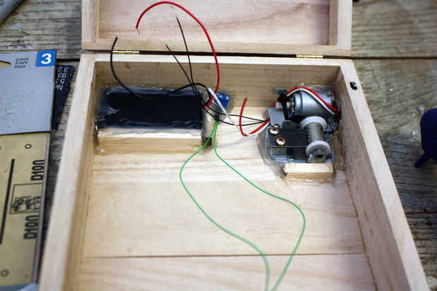 Monte la caja de música mecánica con una tira de madera repuesta y pegamento caliente en su lugar. La caja de música se basa en la resonancia para que una tira de madera fue utilizada para ejercer presión sobre los mecánicos contra la parte inferior de la caja de madera.