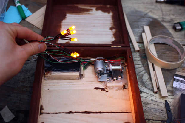 Los LED se conectan a la planta de cajas de música y el positivo está conectado a la caja de la batería, omitiendo la resistencia.