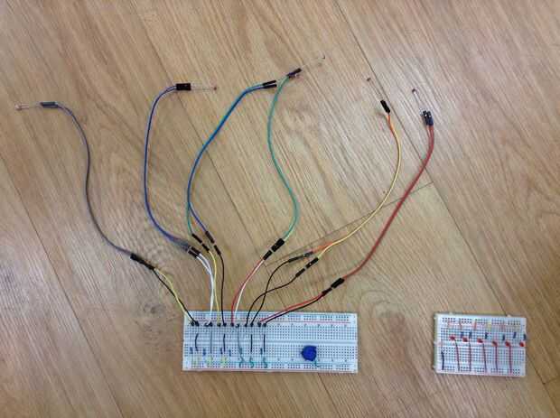 este es mi esquema modificado para ser utilizado con música LED luz caja Instructable de motadacruz.La idea es que, en lugar de usar sólo un canal de tu cable de audio, utilizando dos transistores puede usar ambos canales y alambre para separar caden