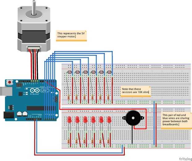 Hacer su propia caja de música!Materiales:Batería de 9VMateriales de la caja (de cartón, tijeras, cinta, marcadores)Energía P1Horquilla de W7Botón de i3I20 Sana del disparadorW6 ArduinoW1 Alambre (2)O3 RGB LEDO5 Motor de la C.C.O24 Synth altavoz(Util