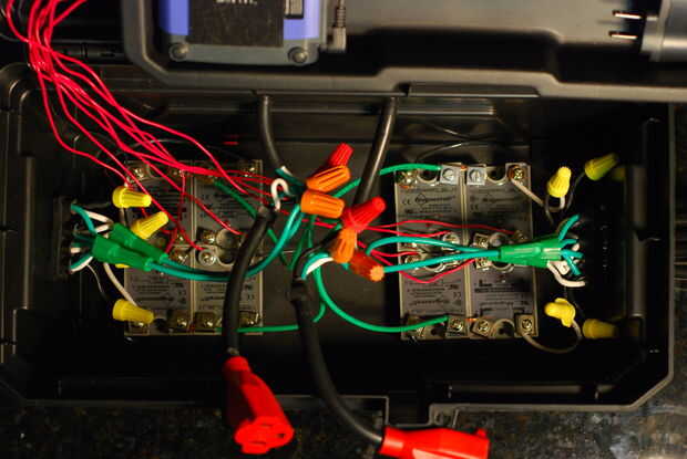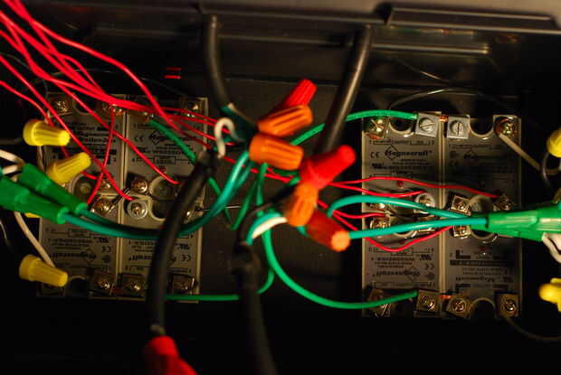 He decidido tener dos enchufes de energía para hacer el cableado un poco más agradable y menos voluminosos. Así que básicamente los ress en la izquierda están conectados a una toma de corriente y el SSRs sobre el derecho a la otra.