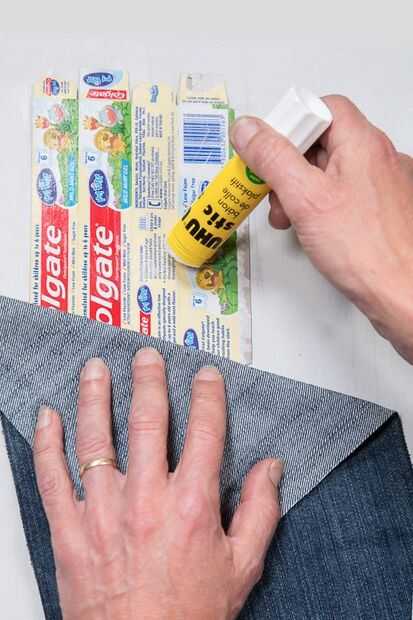 Abrir cada caja y acoplar a la forma original. Use un cuchillo si es necesario para separar las secciones adheridas. Cubrir el lado impreso (exterior) con pegamento. Ponga boca abajo en la parte inferior de la tela.