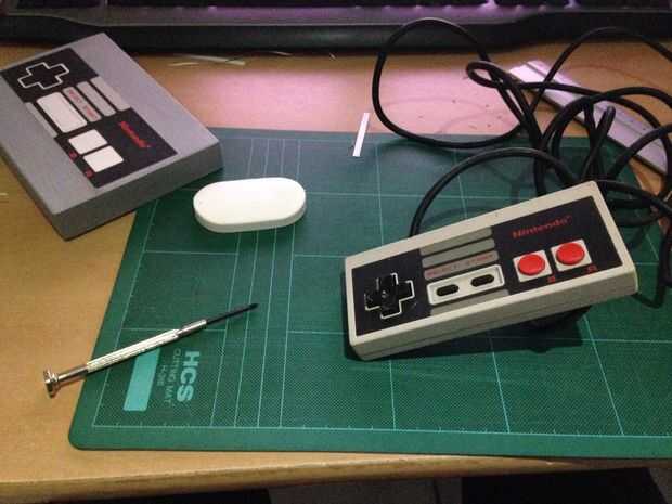 Por lo tanto decidí sacrificio alguno de mis controladores de NES de reserva. Me abrió con un destornillador y utiliza mi cuchillo para formar los botones. Tenga cuidado de hacer esto, usted puede cortar fácilmente a través de los botones o, peor aún los dedos!