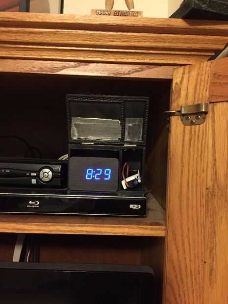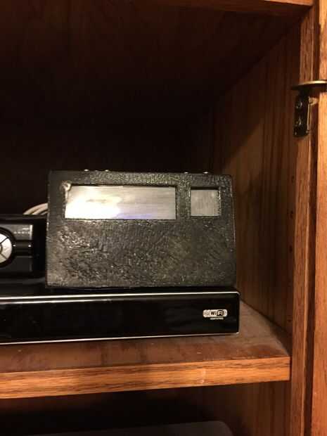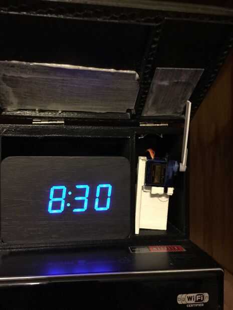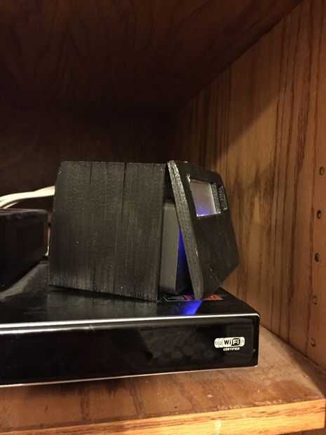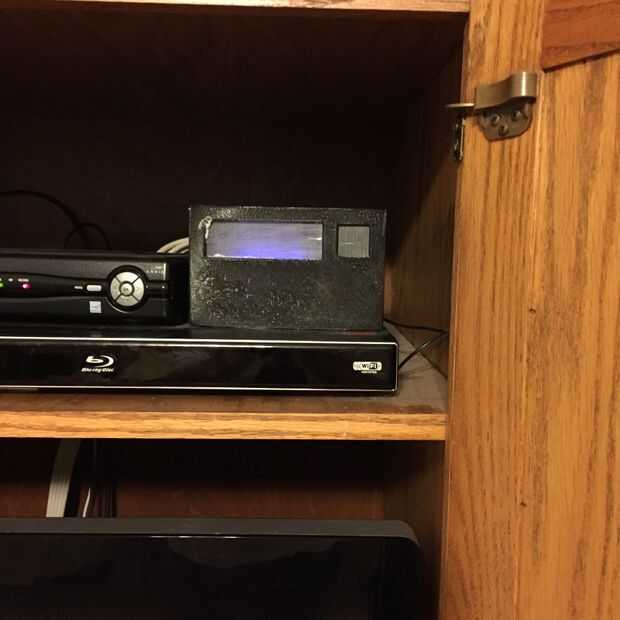 Así que ahora tengo una pequeña caja negra encima de mi soporte de la TV. La puerta está abierta durante el día, revelando el tiempo. Cuando cae la noche y mi esposa cómoda en la cama, ella alcanza para arriba y golpea el IR remote cerrando la puerta. Cuando ella se levanta en la mañana y quiere ver la hora, ella golpea el mando otra vez y la puerta plantea. Personalmente, la luz no me molesta por lo que es un poco algo para hacerla más cómoda. Pero fue una construcción interesante. Espero mejorar con el tiempo, pero justo necesitaba hacerlo operacional en este punto.