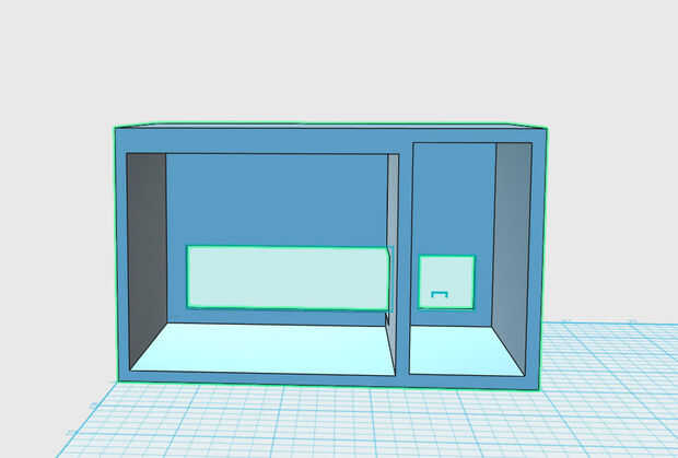 He medido las dimensiones del reloj y sacó un cálculo aproximado de cómo quería el cuadro noche de función. Entonces utilizados diseño 123D de Autodesk para crear el cuadro de la noche y la puerta. Separa el cuadro en dos secciones, una para el reloj y el otro al servo de la casa.