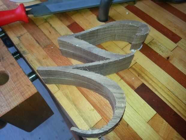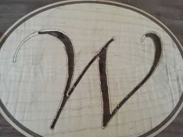 Ahora es tiempo para trabajar en la "W". Fui en línea y encontrar una fuente que me gusto e imprimir una W grande en papel de la impresora para utilizar como plantilla. Me adjunto la plantilla de papel a un pedazo de madera de nogal con adhesivo en aerosol y utiliza una sierra para cortar la forma. He hecho dos de ellos en caso de que uno de ellos se rompió por alguna razón. Me alegro que hice un extra porque efectivamente uno de ellos se rompió en la parte más fina. Traté el extra tan cuidadosamente como sea posible para evitar que se rompa.