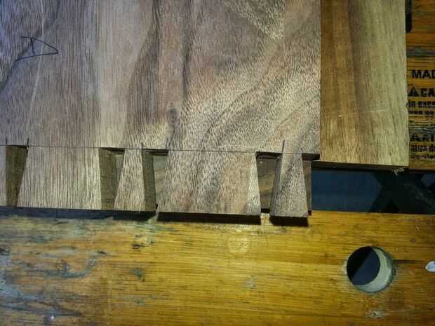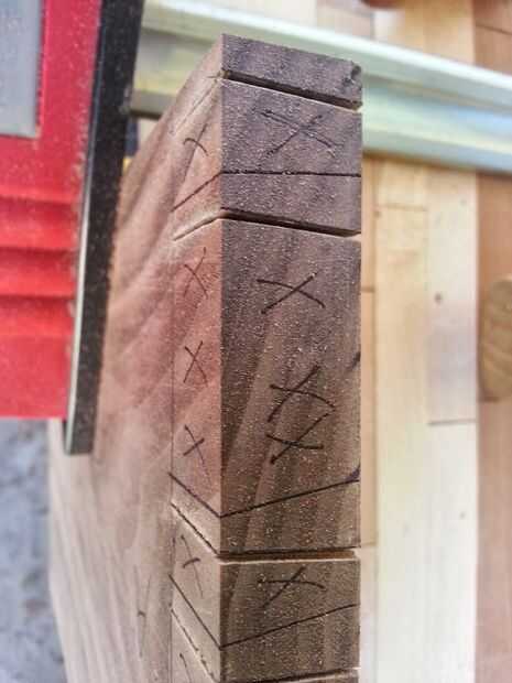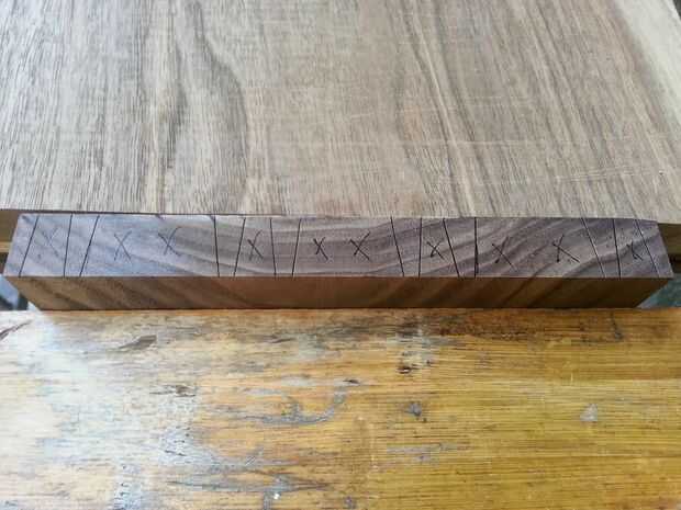 Con la barbilla creada, transfiriendo los pernos era una brisa. He marcado los pasadores con un cuchillo fino y había reforzado las líneas de cuchillo con un lápiz para que pueda ver mejor al aserrar.