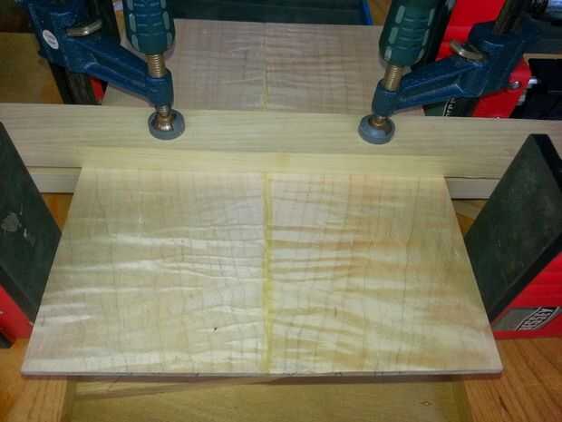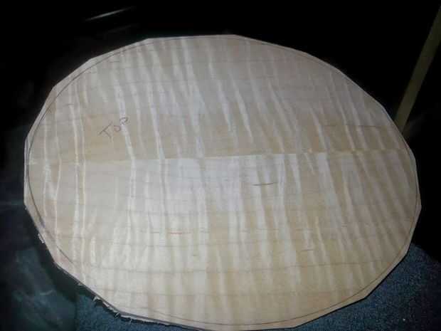 Mi primera orden de negocio fue volver a ver una obra de arce rizado en la Sierra de cinta y pegamento hasta el panel de un amigo. Utilicé una sierra de mano para cortar la mayoría de los residuos. La plantilla oval fue grabada temporalmente en y se utilizó una broca de corte al ras para recortar el óvalo a la perfección.