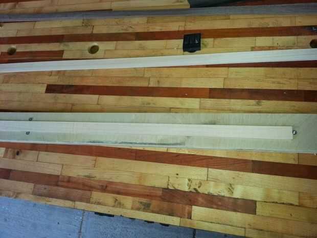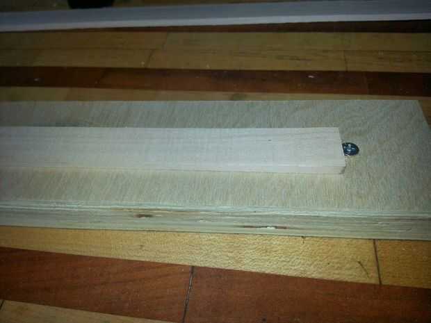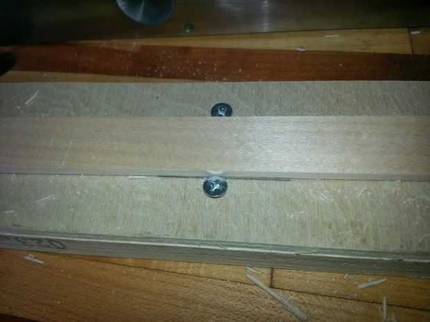 Yo cumplire delgadas tiras de arce y nogal, así que he tomado prestada la tabla de mi amigo Sierra para cortar algunos. Decidí que eran un poco demasiado gruesos para doblar en el óvalo sin romper por lo que he creado una plantilla para sostenerlos en su lugar mientras que usé un plano de la mano para reducir el espesor. Es un pedazo de madera un poco más largo que las tiras con un tornillo en el extremo que actúa como tope y dos tornillos en ambos lados para mantener las tiras en su lugar al cepillado. Esto funcionó bien. Tuve que tomar cortes ligeros por lo que las tiras no quieren doblar al tomar un afeitado.