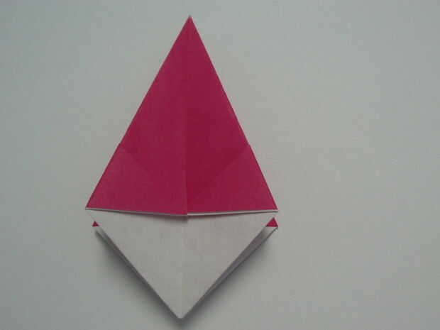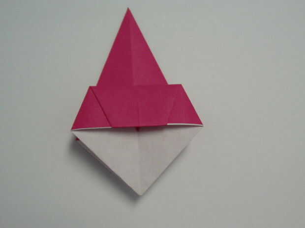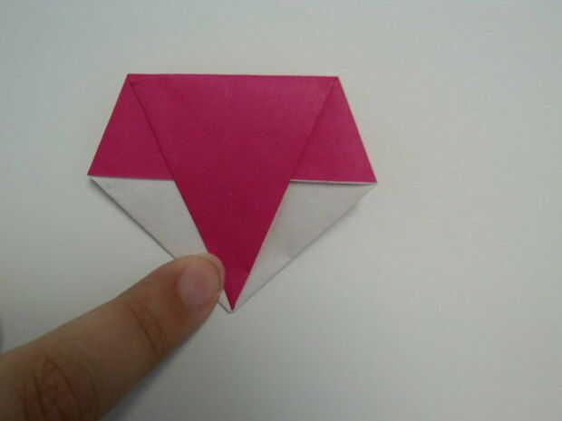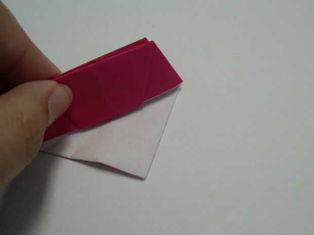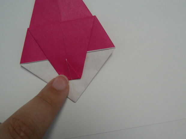 Doblar la parte superior la punta hacia abajo se encuentran en el parte inferior el punto luego llevar la punta respaldo para cumplir en la línea donde se unen el color y papel blanco.