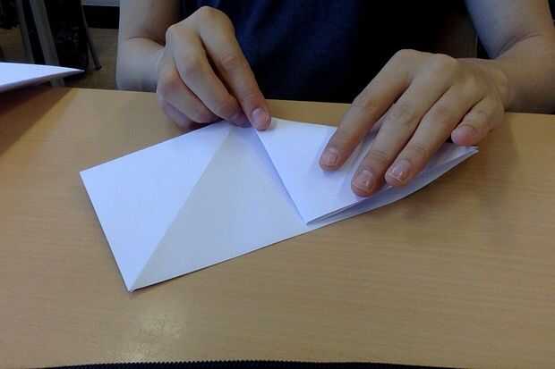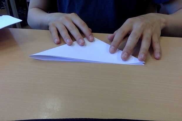 Doblar las aletas del rectángulo de lados opuestos y presione hacia abajo. Usted debe obtener un triángulo como el de la imagen.