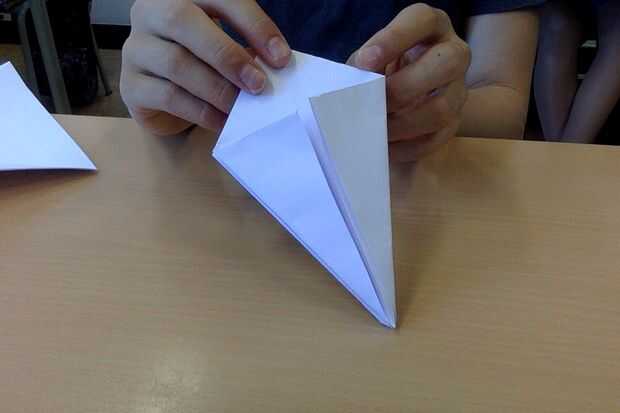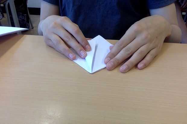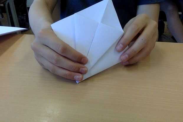 Ahora tienes un cuadrado con las aletas. Doblar estas aletas para el centro. Repetir en el otro lado, y usted debe conseguir a una especie de forma de cometa.