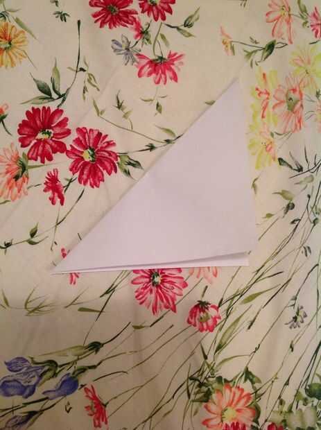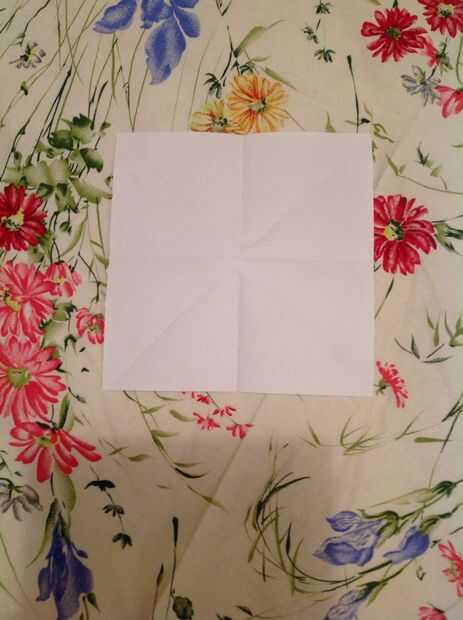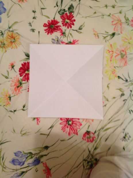 En primer lugar cree dos pliegues diagonales, haciendo dos triángulos y revertir los pliegues, formando un cuadrado otra vez.