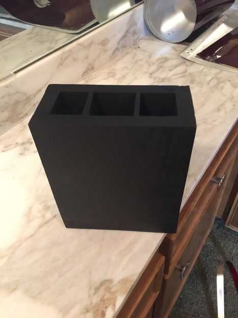 La iglesia que asistí fue en extrema necesidad de un soporte de palo para su kit del tambor. Tenía suficiente tiempo para construir uno así que podría ser utilizado al día siguiente. Necesarios para sostener sobre 9-10 pares de distintos tipos de palos, sólo para estar seguro. Utilicé madera extra de otros proyectos que he hecho antes de este proyecto y terminado de cortar y pegar en una hora, pintura en tres.