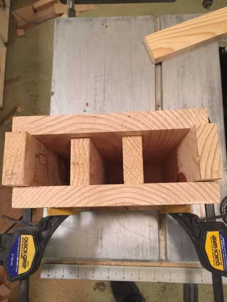 Usé algunos tablones del 5/4 "x 24" y corte 2 piezas hasta 11" de ancho (sea cual sea el tamaño del tablero es) por 10" de altura. Hacer la parte inferior base a 5 1/2" profundidad por 11" de ancho. Esto permite que las ranuras para ser 3". Dos piezas laterales se cortan a 10" de altura por 3" de ancho para que encajen entre los dos tableros grandes.