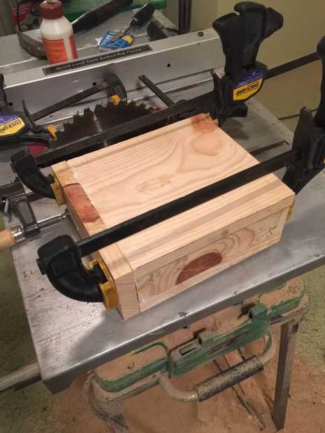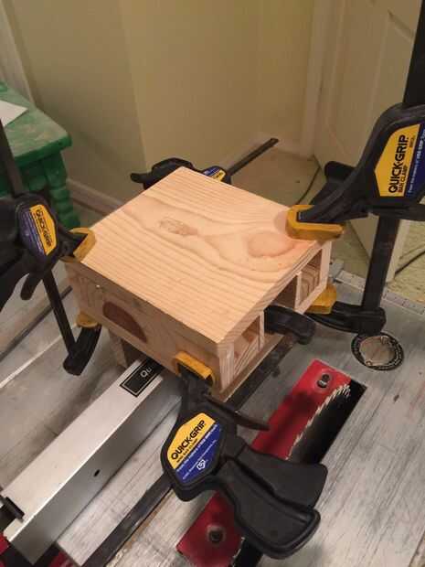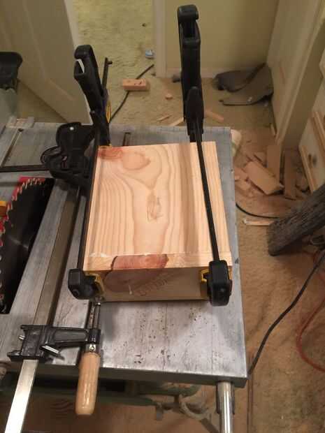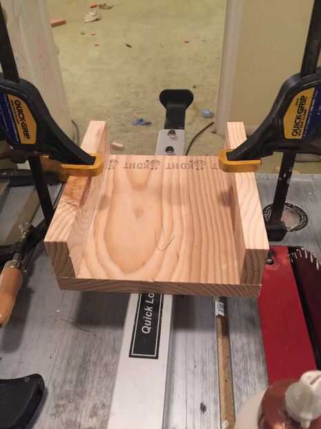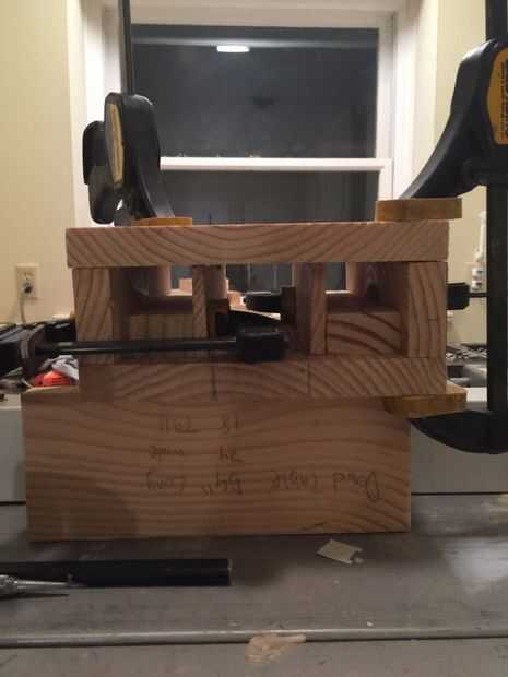 Pegué la pieza superior en después de esperar mis 20 minutos de tiempo de fijación, y después de 20 minutos, coloqué un trozo de bosque (rodado en cinta azul) en el las ranuras y soportado el 1/8" contra ellos, pegados les afianzado con abrazadera y esperó 20 minutos.