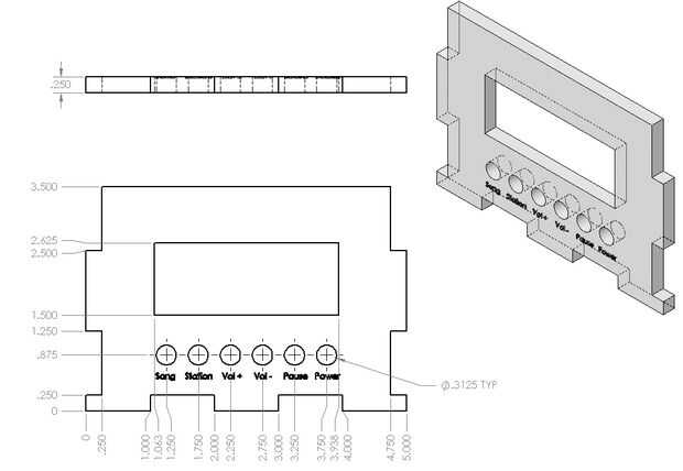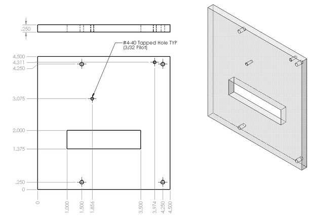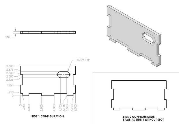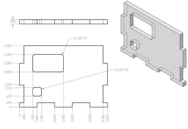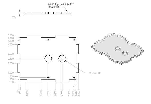 Nota: Las imágenes que adjunto no son a escala. Dan dimensiones de una caja de acrílico 0,25". Después de un viaje a Lowe, decidí usar 0.08" acrílico en su lugar, por lo que las dimensiones se ajustaron por consiguiente cuando se envían a lo cortador del laser. Desafortunadamente, estos planes se pierden en el éter. Usted tendrá que utilizar su juicio con el diseño de la caja. Acceso a un taladro (o taladro) y un grifo de ayuda tremendamente. No recomiendo intente cortar los agujeros más pequeños (3/32") con el cortador del laser - deberán ser taladrados en su lugar.