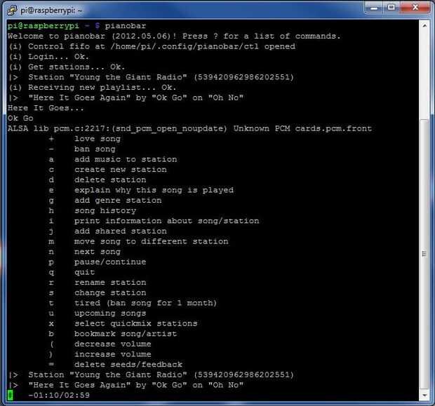 Después de entrar "y" a todos los avisos, Pianobar debe ser instalado correctamente. Mediante la introducción de pianobar en un terminal, el programa comienza. Entra en tu cuenta de Pandora y conseguir una sensación para el programa. (Sugerencia: escribir "?" le dará una lista de combinaciones de teclas para el control de Pianobar)