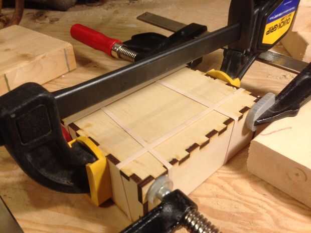 Para mantener las articulaciones de la caja en posición mientras se está secando el pegamento, puede utilizar un par de pinzas en cualquier dirección (si tienes) o envolver un par de elásticos grandes alrededor de su caja en ambas direcciones. Si sólo está utilizando elásticos, compruebe y asegúrese de que sus esquinas son buena y apretada.