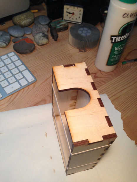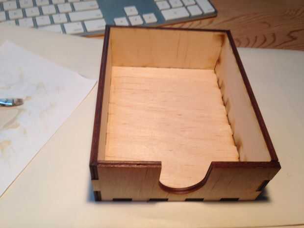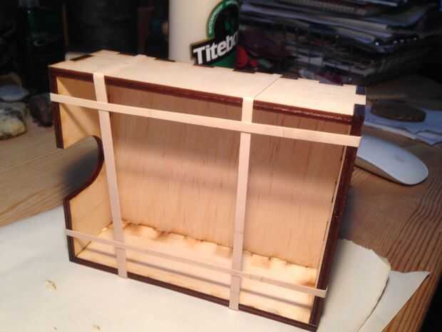 Cortar las piezas de la caja usando un cortador láser. Utiliza energía de velocidad configuración de frecuencia de 12-80-20, para cortar contrachapado de abedul de 1/8" en una fusión de Epilog de 60 vatios láser cortador.
