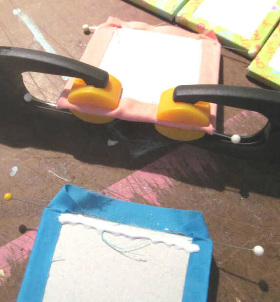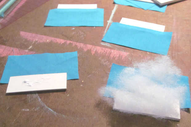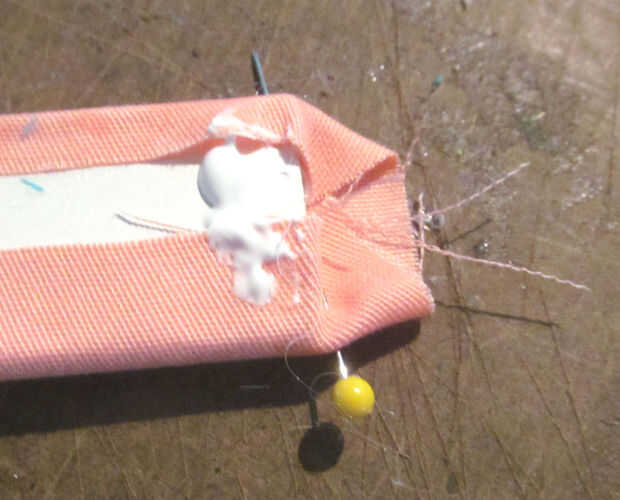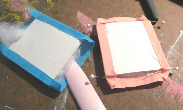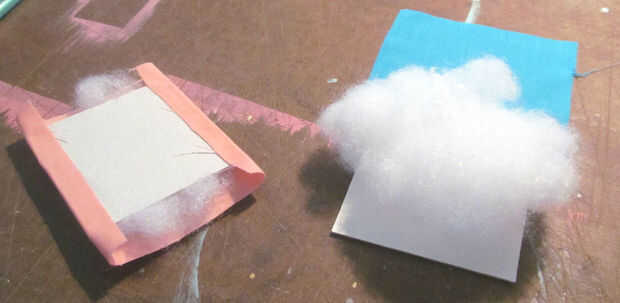 Para hacer el acolchado compartimiento secreto, utilice las piezas de 8-1".  Pegar juntos en pares para formar 4 soportes.  Pegar el revés de la tela de 1/4"- 3/8" en lado largo de cada apoyo y parte superior e inferior.  Después el pegamento se seca voltee la pieza, pone un poco de pegamento en cada uno y presiona algunos relleno de fibra en cada uno.  Meta el relleno de fibra y envuelva a la tela en relleno de fibra y el pegamento a lo largo del otro canto largo de cada soporte, superior e inferior.  Dejar secar y luego meter el resto de la fibra en los otros bordes.  Dobla y cubrió las esquinas en pegada y sujeta los bordes restantes.