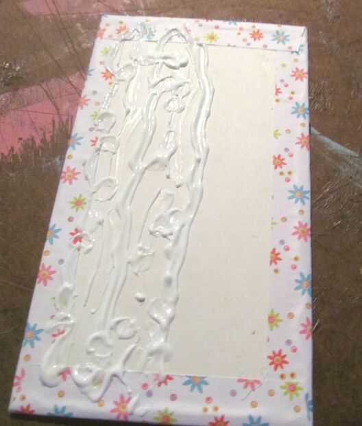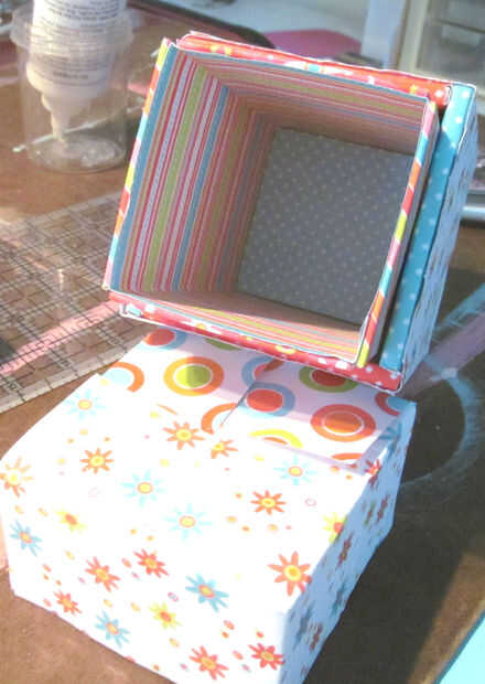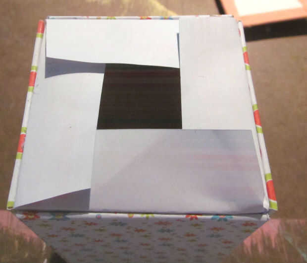 Next, construct the inner box.  Pude usar un pedazo de papel para hacer el forro interior de la caja.  Pegué las piezas hacia fuera de un pliegue del centro.  Deja un lado sin pegar parcialmente para que el trabajo extra puede pegado detrás de él cuando los lados se han unido en la forma de la caja.  Hay adicional en cada extremo.  El otro se pega en el interior de la caja.  Se utilizará papel extra en la parte inferior para sujetar la parte inferior de la caja y tapa de compartimiento secreto.  Después de que los lados estén secos, invierta la caja y arreglar el papel como se muestra.  Pegar la parte superior del compartimento acolchado a los papeles.  Pegar la parte inferior de la caja en su lugar en el interior.
