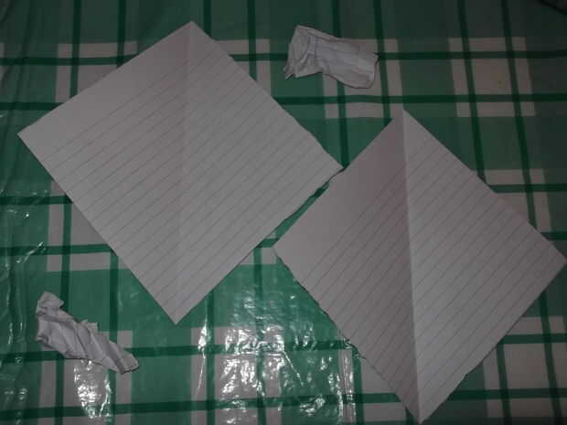 Cortar la parte inferior de las dos piezas de papel para que terminaras con dos cuadrados de papel.