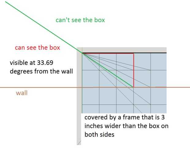 Los diagramas anteriores muestran un ejemplo de cómo se puede saber hasta qué punto las paredes será visible. Si inserta la proyección y profundidad de la caja en "lado un" y "Lado b" aquí: http://www.csgnetwork.com/righttricalc.html obtendrá el ángulo de la pared, momento en el que la caja está visible.