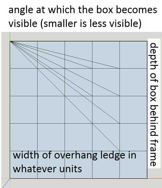 - Las paredes de la caja serán visibles en diferentes ángulos dependiendo de la relación de frontera a profundidad que deje (es decir, el labio deja alrededor de la caja donde sobresale el marco a la profundidad de la caja).En el 1:1, usted necesita para tener en cuenta un ángulo de 45 grados de visibilidad (algo más grande y la caja no es visible). Aquí está una lista de mediciones útiles - border_width:depth_of_box; ángulo que las paredes de la caja se hacen visibles