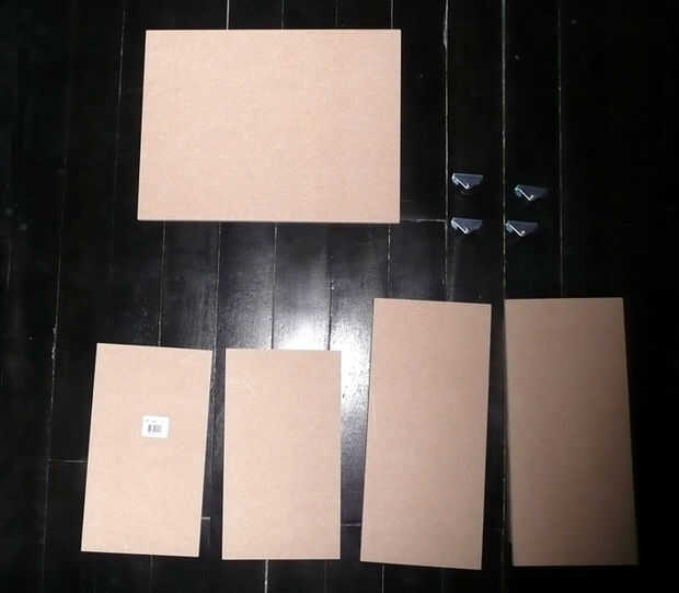 Necesita 5 tableros de madera. He utilizado planchas de densidad media (MDF), grueso 1cm: -40 cm x 18 cm -40 cm x 18 cm -32 x 18 cm -32 x 18 cm -42 x 32 cm