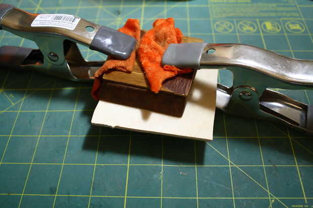 Una vez que todo lo que te gusta, encolar, abrazadera y terminar con una capa superior si lo desea. Ser conscientes de cualquier pegamento que sale entre las piezas y límpielo con un paño húmedo. Al pegar la madera, normalmente utilizo un tablero separado para cubrir la superficie y fije de eso, puesto que las pinzas pueden dejar sus propias marcas, pero en este caso, cualquier pegamento que escapó hacia fuera mientras que secar permanentemente podría enlazar el proyecto a mi sujeción tablero. Usted puede ver en las fotos cómo escapó más allá de esto, renunciando a la Junta y con algo de tela para ablandar las pinzas estratégicamente colocadas.