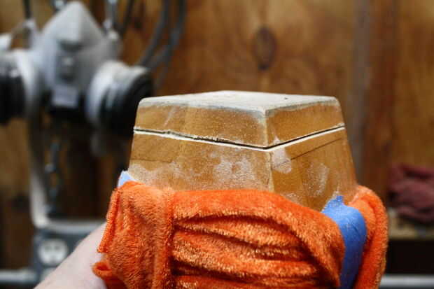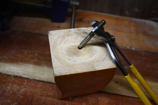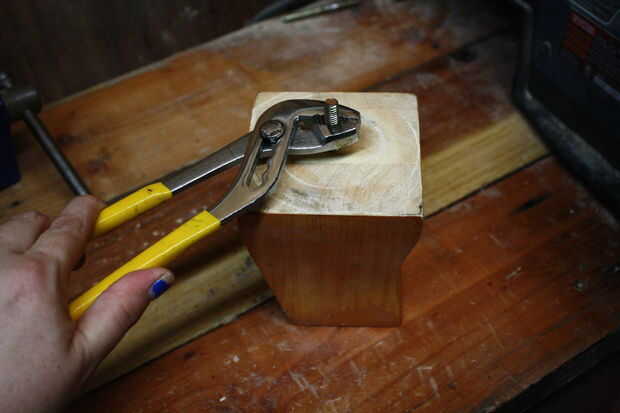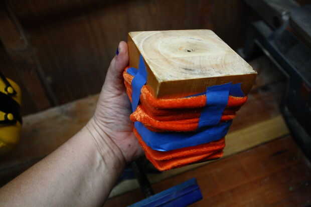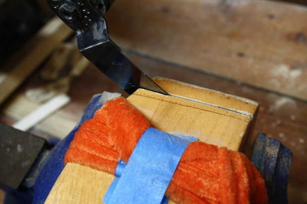 Siempre recomiendo usar tornillos de banco, como nunca me encuentro con bastantes manos, y los dos tengo que prefieren mantener. Utilicé un trozo de tela y unas cintas para dar a la madera un poco acolchado protector. No hay ninguna técnica oficial para esto, usted puede ser tan descuidado como con su relleno mientras los cojines. Planeé desde el principio para pulir y acabado de que la madera en el extremo, así que un poco de raspado fue bien. Usted puede mantener el acabado que le dieron los fabricantes, sólo tendrás que ser un poco más cuidadoso evitar que se dañe.