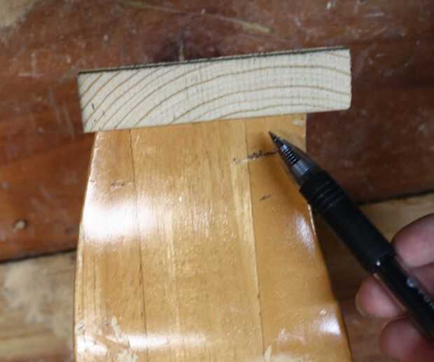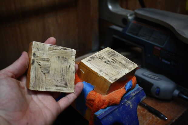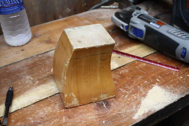 A continuación, planificar su ataque. Usé la Multi-Max con un color madera corte accesorio para quitar el centro del pie. Como una herramienta oscilante y con eso particular accesorio plano, es una buena opción para cavar en los lugares de lo contrario tendrás que abrir para llegar a. A menos que usted está trabajando con una pieza muy superficial de la madera, es más fácil trabajar en ahuecar el centro de ambos extremos, así que este es el momento de decidir qué desea hacer con los extremos. Yo quería tener la parte ancha como la base de mi caja y una tapa en el extremo más estrecho. Hice las marcas alrededor de la cuadra donde yo planeaba cortar la pieza que se convertiría en la tapa. En este pie, verás que tiene este tipo hermoso, wonky de forma, así que en lugar de tratar de medir con una regla, utiliza un bloque de madera con más o menos la profundidad quería y había trazado a cada lado. Puesto que quería acceso a la parte inferior, he decidido cortar y utilizar un pedazo de madera contrachapada para sellar la base. Si se prefieren utilizar exclusivamente este bloque de madera, puede cortar el otro extremo de la manera que hiciste la tapa y reglue una vez hecho el interior.