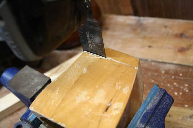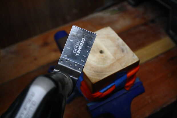 Sujete el pie en y la Multi-Max para empezar una ranura poco profunda a lo largo de la línea de la tapa. Rotar cuando tenga que llegar al otro lado, usted querrá hacer la ranura toda la manera alrededor antes de empezar a profundizar. Corte en las esquinas y los lados me pareció útil para asegurarse de que el corte era uniforme alrededor. Cortar poco a poco, sigue avanzando. Si ves humo procedente de la madera, sí, de hecho es una señal de que está caliente y es hora de cambiar a un nuevo punto. Y si la herramienta se pone demasiado caliente, le dan un descanso y hacerte con un vaso de agua. Corte de madera siempre me da sed.