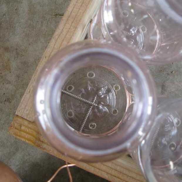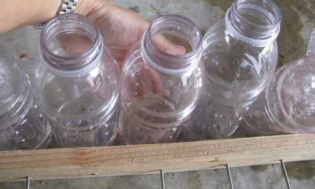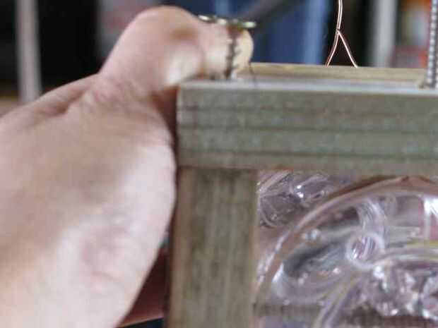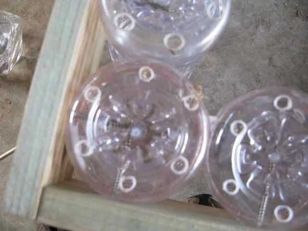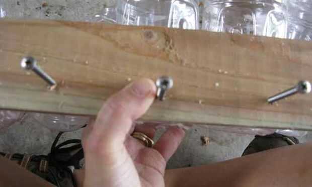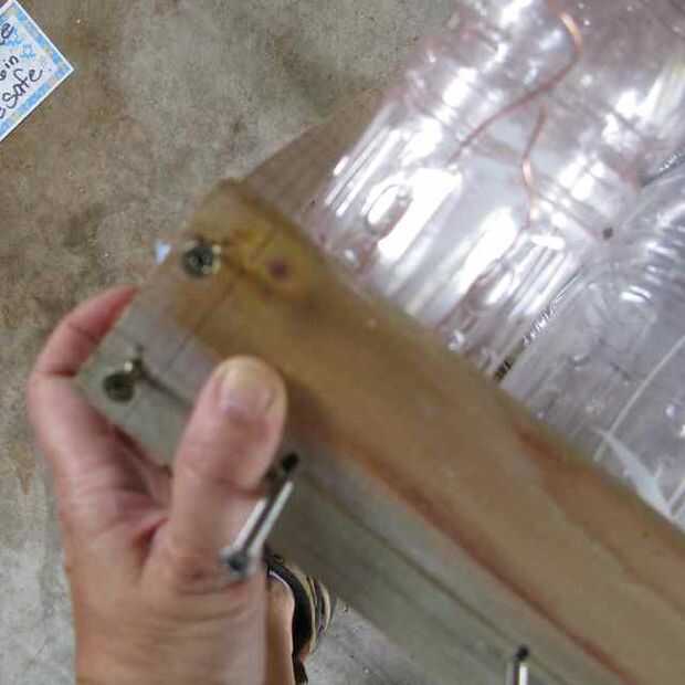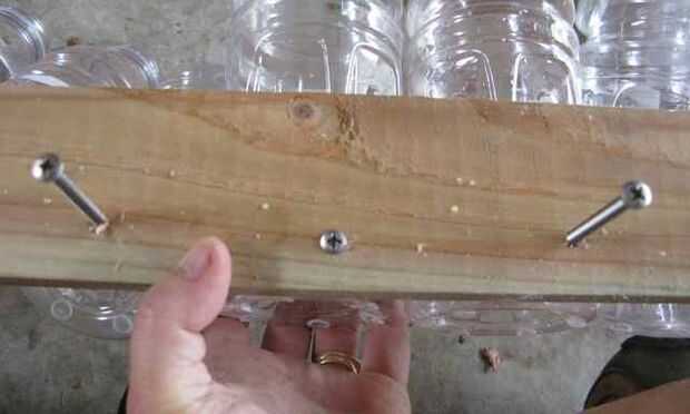 Gire el proyecto para que los lados de la serpiente son verticales al suelo. Coincidir los bordes de la madera superpuesta, manteniendo el conjunto al ras y la Plaza. Las botellas no se ajusten perfectamente, pero son plásticos y flexibles, así que fuerza la descarga de las esquinas. Mantenga las tablas firmemente con una mano y con la otra mano, atornille los tornillos de conexión.