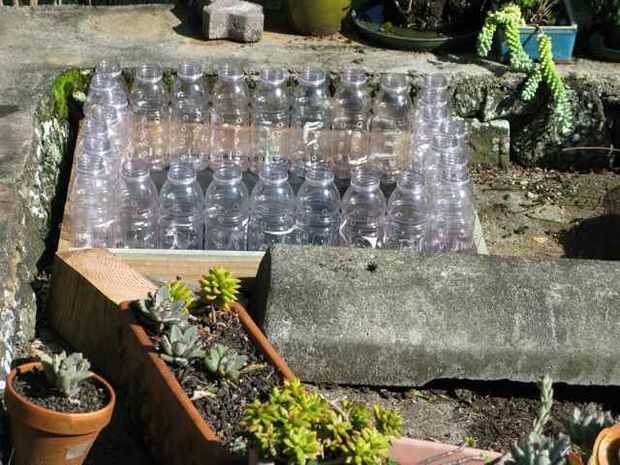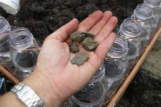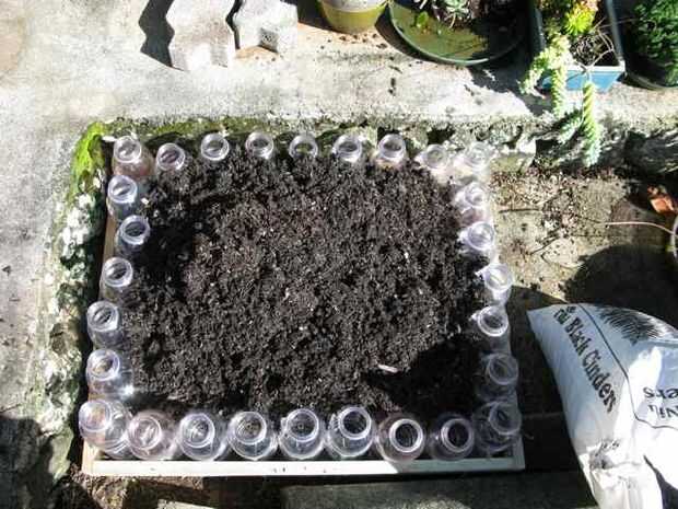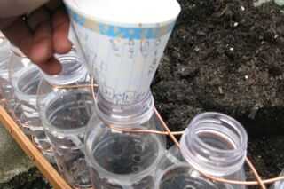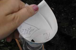 Doble un pedazo de papel en un cono, dejando un agujero en la parte inferior lo suficientemente grande para las piedras y la tierra para caer a través, pero suficientemente pequeña para caber en la boca de la botella.