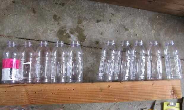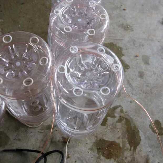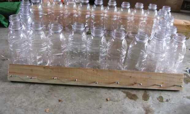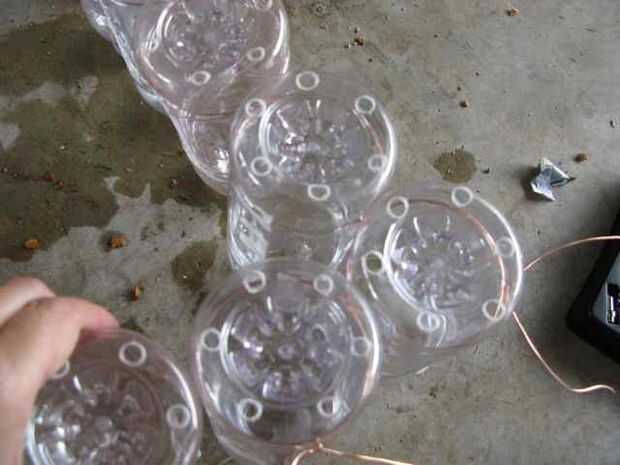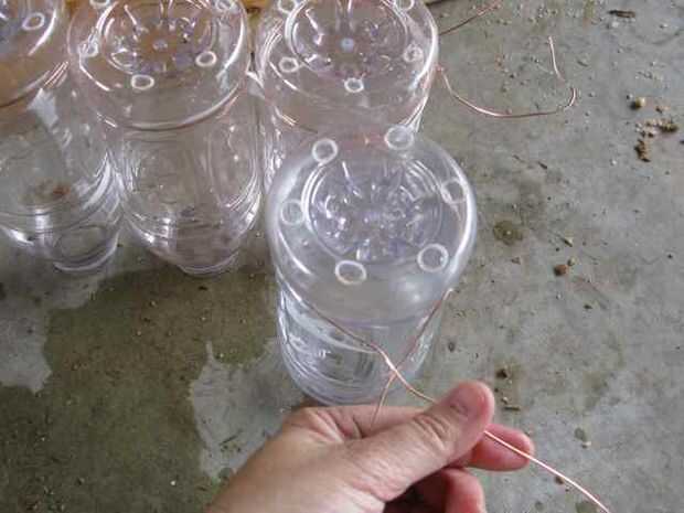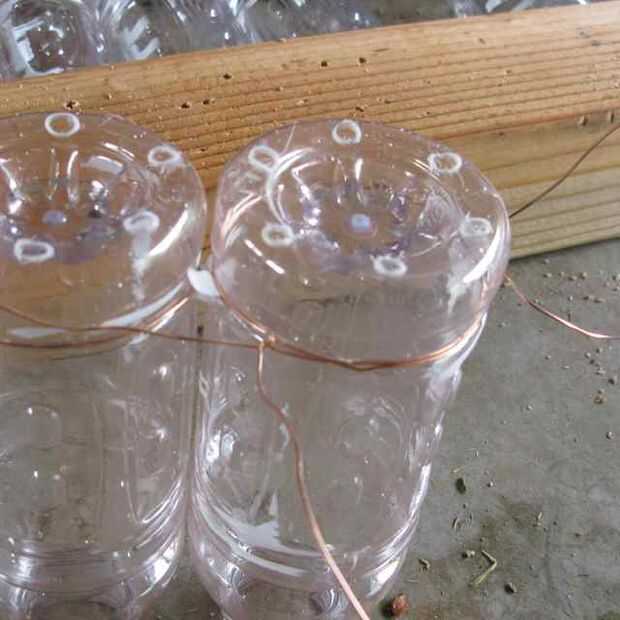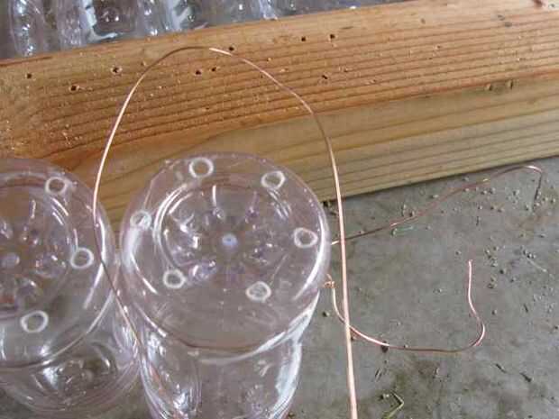 Poner una de las botellas sueltas al lado este y retuerza los extremos alrededor de la segunda botella, continuar con la tercera botella y así sucesivamente, hasta llegar a la última botella.